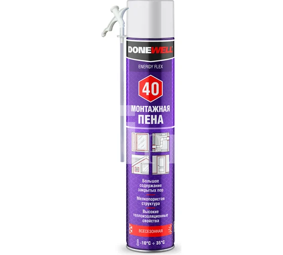 Пена полиуретановая монтажная бытовая всесезонная DONEWELL ENERGY FLEX 40 — это высококачественный строительный материал, предназначенный для различных монтажных и изоляционных работ.