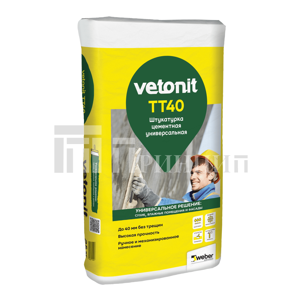 weber.vetonit TT40 - универсальная цементная штукатурка. Подходит для оштукатуривания фасадов, для предварительного выравнивания и ремонта стен и потолков в сухих, влажных и мокрых помещениях перед дальнейшим шпаклеванием, перед облицовкой керамической плиткой. Применяется по основаниям из бетона, кирпича, керамзитобетонных блоков, цементных штукатурок. Обладает повышенной влагостойкостью, высокой прочностью, трещиностойкостью, морозостойкостью. Для внутренних и наружных работ. Наносится ручным и машинным способом.