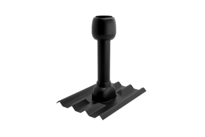 Особенностью данной вентиляционной трубы является ее устойчивость к погодным условиям: она препятствует проникновению дождя, снега и других атмосферных осадков, защищая подкровельное пространство от избыточной влажности. Благодаря черному цвету, она гармонично сочетается с кровлей, сохраняя эстетический вид кровельной конструкции.